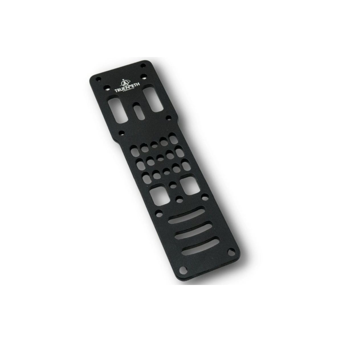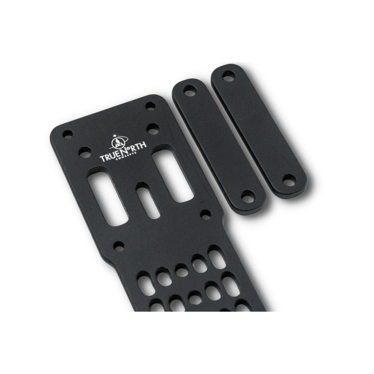 The True North Concepts Modular Holster Adapter is engineered to provide a rock solid, flex free platform for mounting your holster. Unlike standard polymer belt adapters that can shift or bend under pressure, this system uses 0.190 in thick domestically produced 6061 T6 aluminum for unmatched strength and stability. The Milspec Type III Class 2 hardcoat anodized finish ensures long term durability with a non reflective surface built for tactical environments. Designed for professional use, the MHA clamps your belt securely between the aluminum adapter and color matched MOLLE belt bars, eliminating unwanted holster movement and delivering consistent performance in any condition. With three vertical mounting points spaced at 0.5 in increments and a 20 degree cant range, shooters can dial in the perfect draw angle and ride height to suit personal preference and mission requirements. The MHA supports Safariland three hole pattern holsters along with a wide range of popular options including G Code RTI Blackhawk Omnivore T series and EPOCH Alien Gear Rapid Force Dara Duty Holsters and others using the standard mounting pattern. It is also compatible with QLS MLS and ELS quick detach systems, and includes top mounting points for Tek Lok and MOLLE hardware like MALICE clips. The system installs on MOLLE battle belts, gun belts, or trouser belts up to 2.25 in wide and is designed to integrate seamlessly with modern minimalist belts used by SOCOM and professional communities such as GBRS Group, Blue Force Gear, AXL, Ronin, and Tyr Tactical. Every Modular Holster Adapter comes with a complete hardware kit of screws, posts, spacers, and threadlocker for secure installation, along with a lifetime no questions asked replacement guarantee. Proudly made in the USA and Berry Compliant, the True North Concepts MHA sets a new standard for holster mounting solutions. Available now for shooters who demand reliability, adjustability, and professional grade performance.