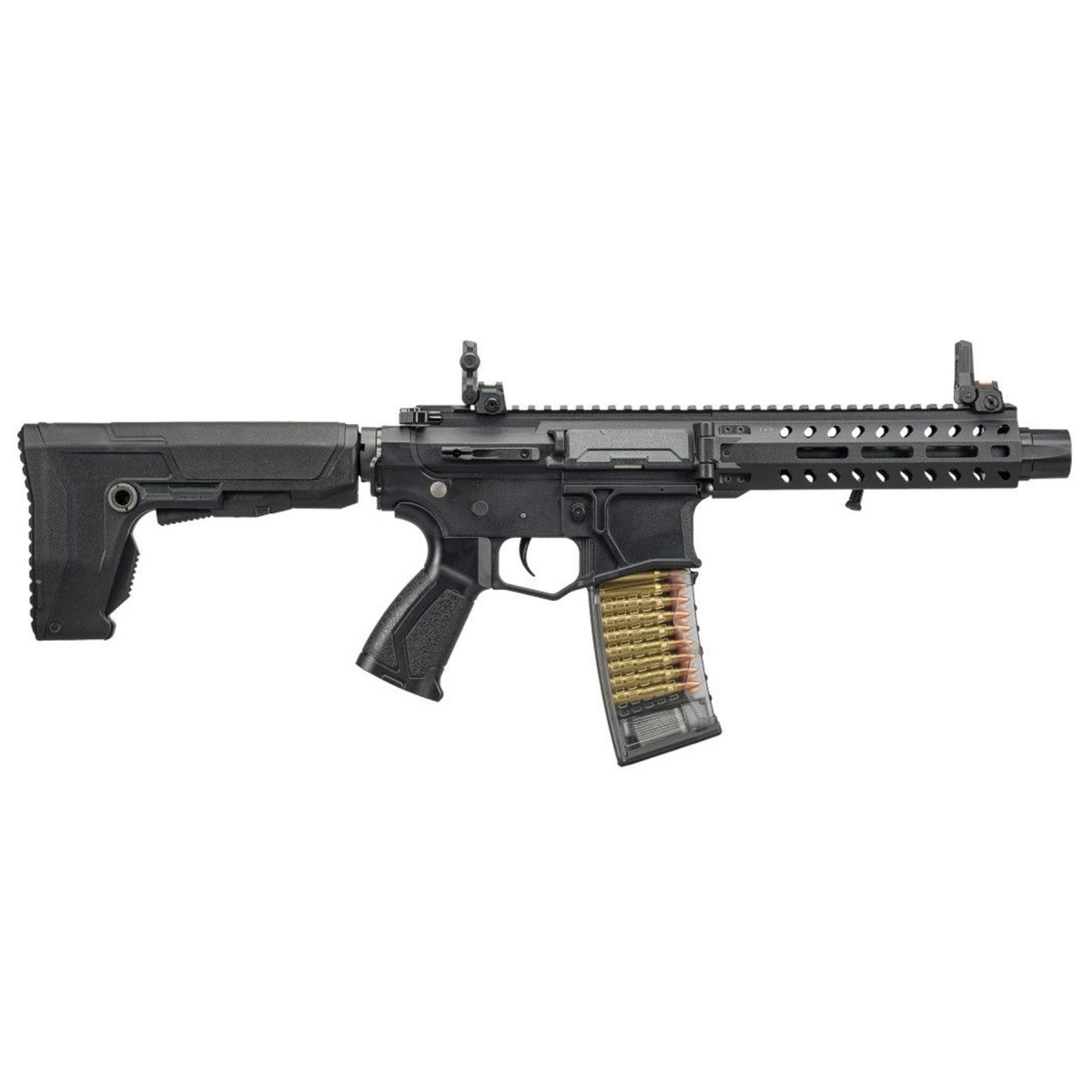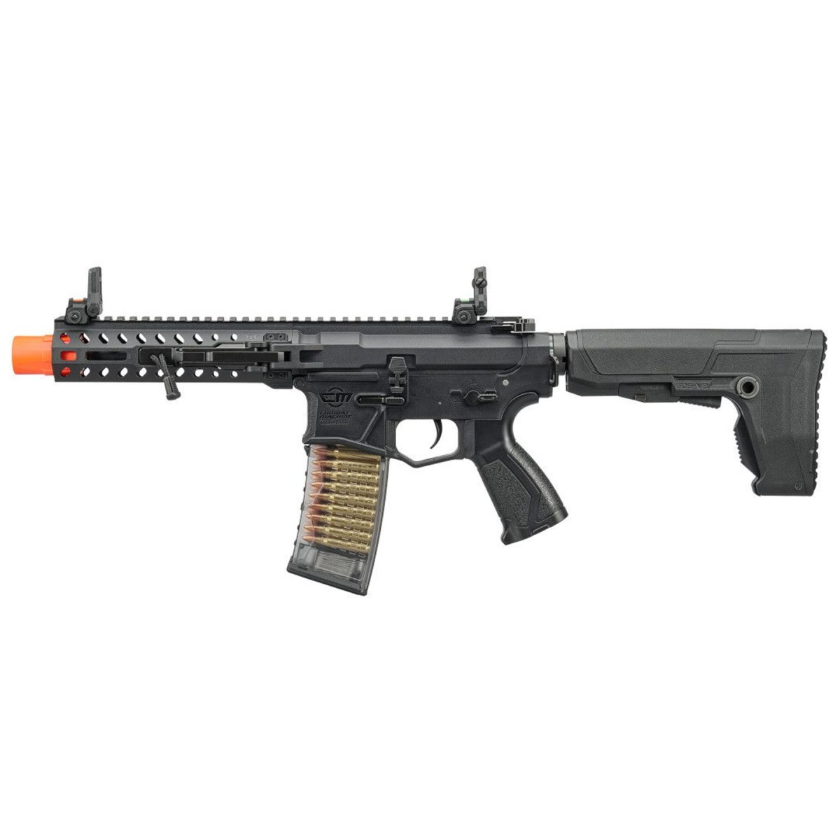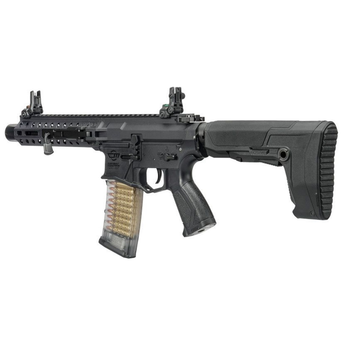 Internally, the upgradable Version 2 MIG gearbox provides a reliable and proven foundation for long term durability and future performance upgrades. Ambidextrous controls including the fire selector switch and magazine release ensure smooth operation for left or right handed shooters. The GOS-V8 adjustable stock enhances ergonomics, delivering a stable shoulder fit that supports controlled follow up shots. Dual profile fiber optic flip up front and rear sights allow for fast target acquisition, while the included 30 round mid cap magazine promotes dependable feeding and a realistic loadout. Finished in black, the G&G CM16 GMS STRIKER Folding MLOK M4 AEG stands out as a modern, programmable airsoft gun designed for players who demand compact handling, responsive electronics, and trusted G&G build quality in one streamlined package.