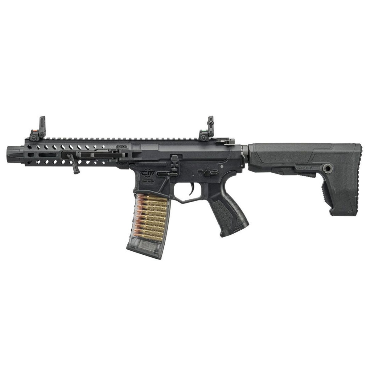 The G&G CM16 GMS STRIKER Folding MLOK M4 AEG Airsoft Rifle w GATE ASTER in Black delivers compact adaptability with advanced electronic performance. Built on a CM16 GMS STRIKER M4 AEG platform, this airsoft rifle features a durable G&G polymer receiver paired with a folding MLOK handguard configuration that enhances portability and storage without sacrificing accessory compatibility. The integrated GATE ASTER SE optical MOSFET elevates this electric airsoft gun with refined trigger response and intelligent control. Through the GCS app, players can program trigger sensitivity, pre cocking, and selector options, allowing the rifle to be tailored to individual play styles. A true quick change spring system accessible through the buffer tube makes FPS adjustments straightforward for different field limits, giving this M4 airsoft rifle flexibility for both indoor CQB arenas and outdoor skirmishes.