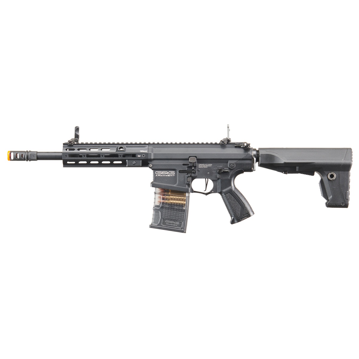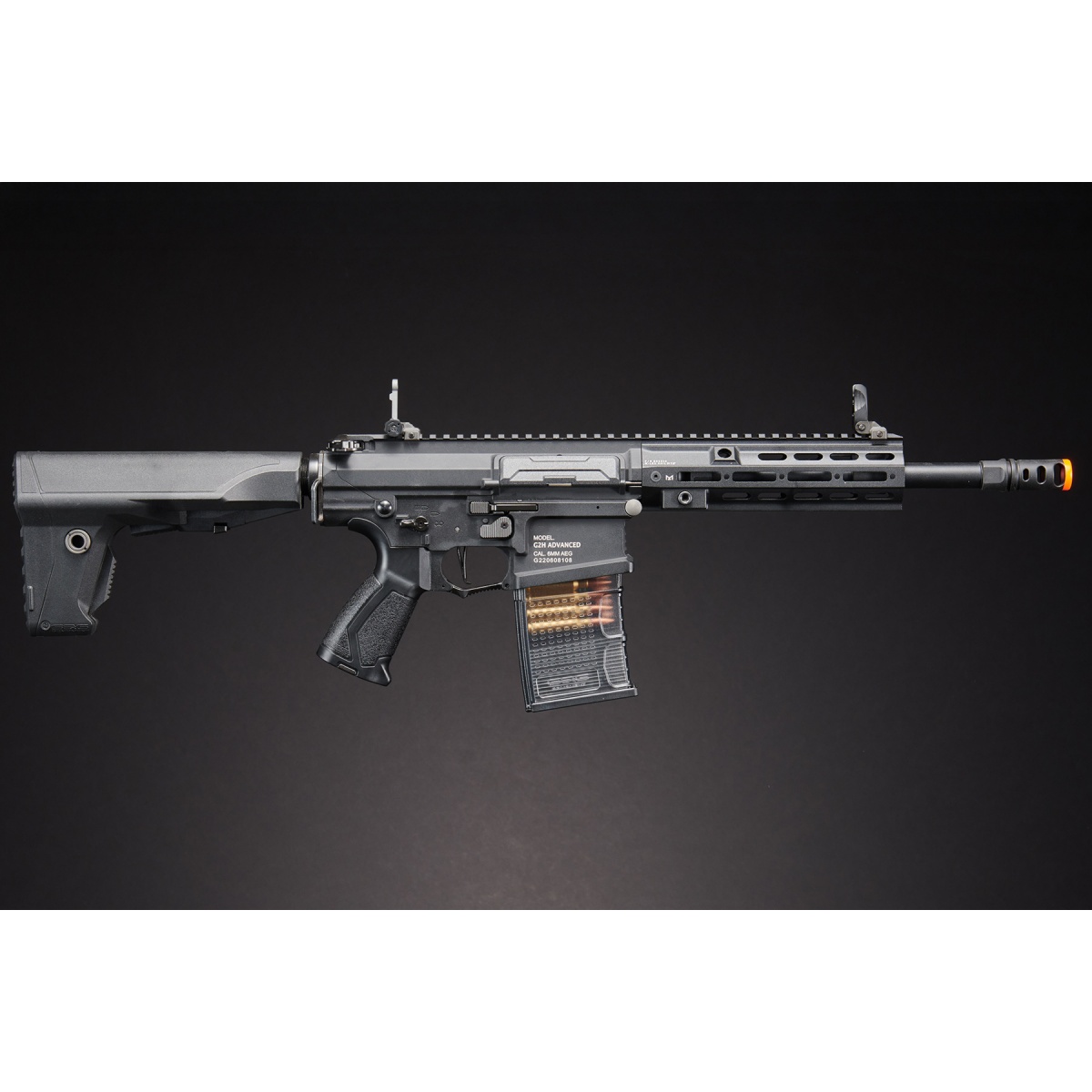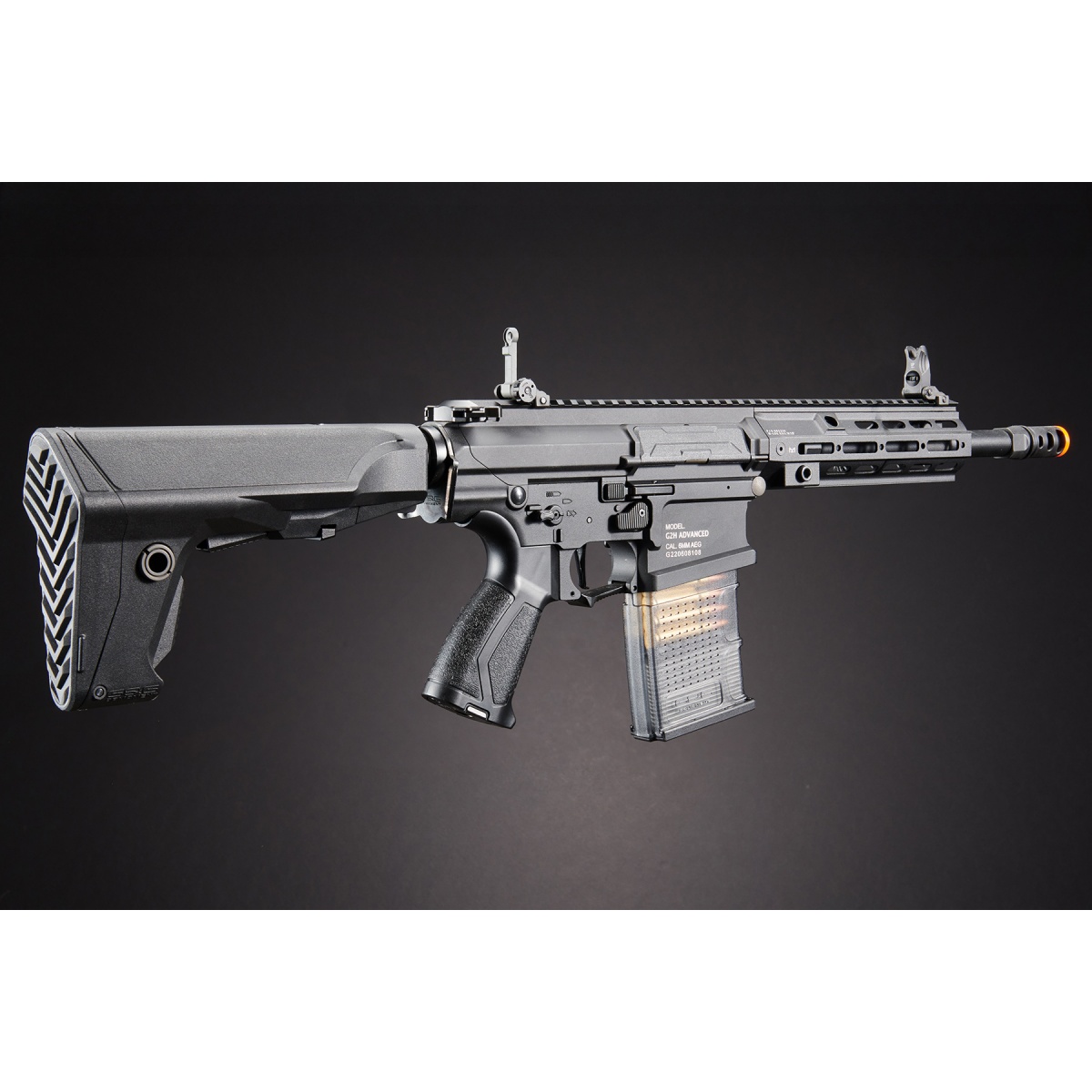 The TR16 SBR 308 MK1 is another great addition to G&G's line of premium airsoft guns that are in the market. This model comes with a larger 308 style magazine for those that want a beefier set up. The receiver and M-LOK rail system are constructed out of metal for a sturdy and solid build. The M-LOK rail is capable of hosting rail segments to attach different accessories like a vertical grip, flashlight or anything else you may need. The airsoft gun has a left hand friendly capability with the ambidextrous charging handle, fire selector, rear sling mount and magazine release. The ergonomic six position crane stock holds the battery compartment and has a rubber pad for extra comfort on shouldering the airsoft gun. The bolt locks back to adjust the hop up of the airsoft gun with ease. A quick change spring system allows you to swap out the spring to manage the FPS you desire. Switch the spring to reach the 350 FPS limit required for most close combat fields! The electronic trigger unit is now 50% reduced in size compared to its predecessor. This version's electronic trigger unit features an electric cut off when no magazine is inserted. G&G has include a proprietary mid capacity magazine that cuts off the electricity when there are no more BBs left. There is also a micro speaker that beeps when there is a low battery or gearbox issue that is not allowing you to shoot the airsoft gun properly. No additional tools are needed to adjust the full auto fire to 3 or 5 round burst with the assistance of the installed G2 MOSFET. Internally, the gearbox shell is reinforced with height and thickness to hold up through tougher usage over time. There is a redesigned bevel gear that lowers power consumption and has less heat generated to keep the stress to a minimum. The air nozzle and thicker padded cylinder come with a double o-ring to keep the compression tight for better air flow and consistent FPS. G&G has also installed a cover near the top motor area so that the pinion gear does not tear up the wires. Overall, the G&G TR16 MBR 308SR G2 M4 packs a ton of features that will withstand plenty of shots within the years to come.