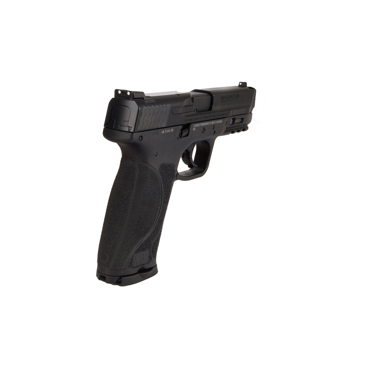 The Smith & Wesson M&P 9 CO2 Blowback Airsoft Pistol in black is a high-performance replica that delivers both realism and reliability, making it an excellent choice for players, collectors, and training applications. Built with a heavy-duty polymer frame combined with a metal alloy slide and barrel assembly, this pistol balances lightweight handling with long-lasting durability. Shooting at an average velocity of 315 FPS with 0.20g BBs, it provides consistent semi-automatic fire powered by readily available 12g CO2 cartridges. With a functional blowback system, players experience realistic recoil and slide cycling that mirrors the feel of the real firearm. The drop-free 16-round magazine ensures smooth reloading, while the adjustable hop-up allows users to fine-tune accuracy and range to match different play styles. Measuring at a true-to-life 1:1 scale, this model is ideal for competitive airsoft games or as a training implement. Packed with features, the M&P 9 CO2 Blowback Pistol includes a 20mm under-barrel rail for attaching tactical accessories such as lights or lasers, giving players the flexibility to customize their sidearm for any scenario. The realistic breakdown makes cleaning and maintenance straightforward, extending the pistol's service life and ensuring reliable field performance. Designed with authentic fire controls, a frame-mounted safety, and laser-engraved Smith & Wesson trademarks, it captures the look and function of the law enforcement-issued M&P 9 with remarkable detail. Whether you're looking for an authentic training pistol, a dependable sidearm for your loadout, or a collector's piece with licensed trademarks, the Smith & Wesson M&P 9 CO2 Blowback Pistol stands out as a top-tier option. Combining power, realism, and performance, this pistol is perfect for players seeking a versatile, durable, and authentic addition to their airsoft arsenal.