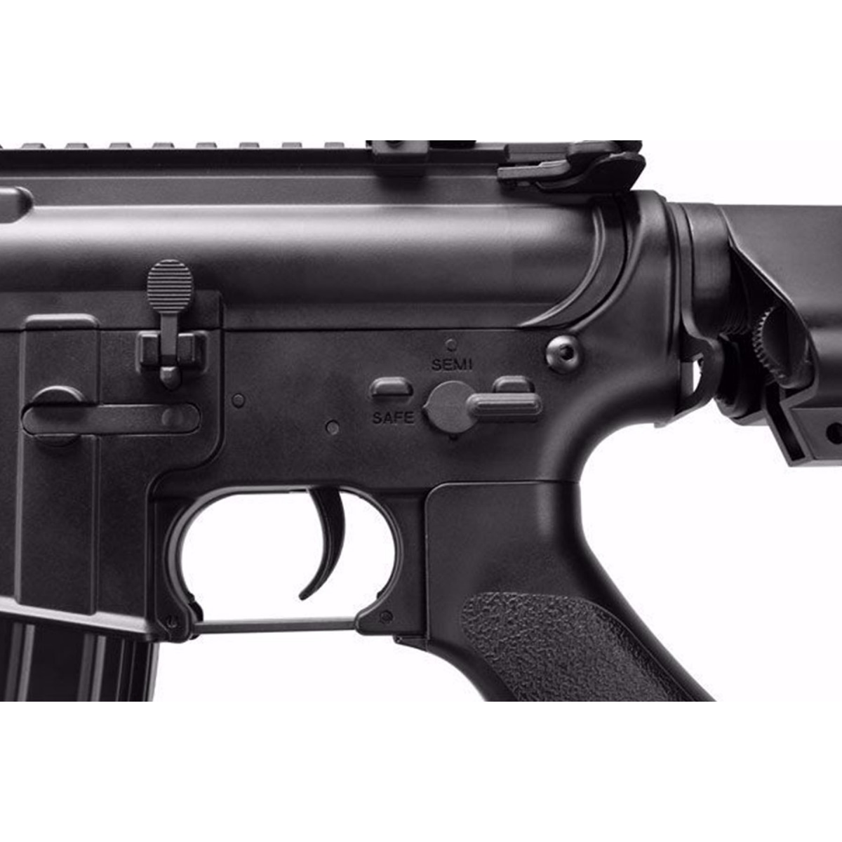 The Elite Force XM4 EyeTrace AEG Airsoft Rifle with built in tracer unit in black is a versatile electric airsoft rifle designed for players who want strong performance with added night game capability. Operating as a full electric automatic platform, this airsoft gun delivers consistent output at up to 400 FPS with 0.20g BBs and a rate of fire reaching 800 RPM. The integrated EyeTrace tracer system enhances BB visibility in low light and nighttime environments, making it easier to track shots and adjust aim during fast paced engagements. An adjustable rear stock allows players to fine tune length of pull for comfort and control, while the ergonomic pistol grip supports confident handling during extended skirmishes. Flip up front and rear iron sights provide reliable backup aiming options, and the adjustable setup makes this rifle suitable for a wide range of airsoft play styles.