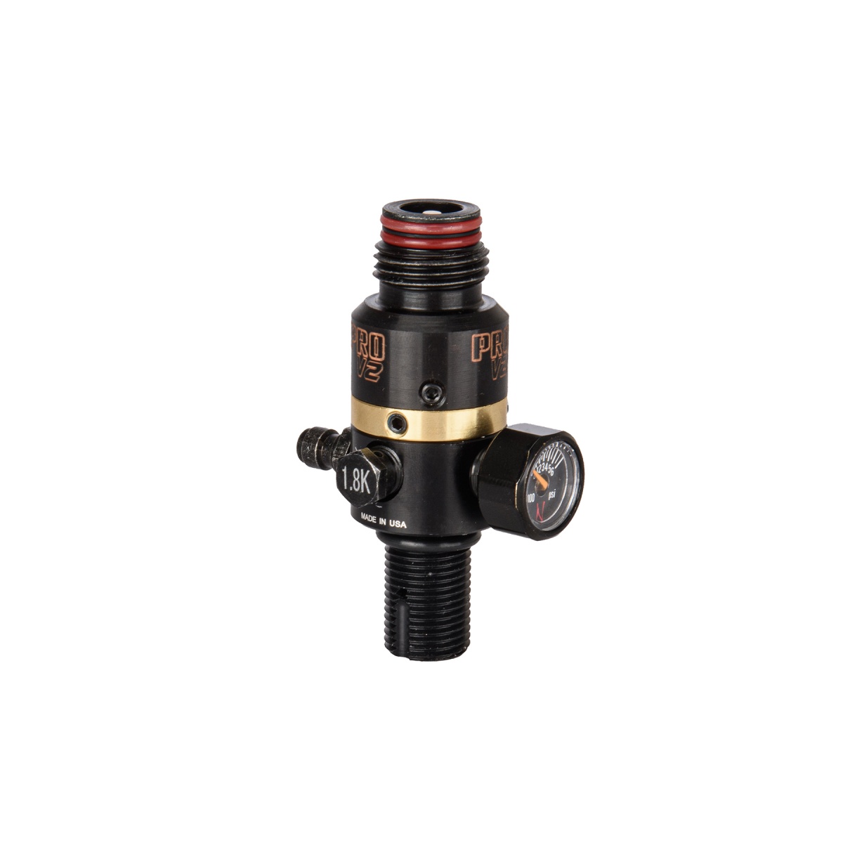 The Pro V2 Adjustable gives 30% better airflow over other regulators. The pro v2 psi can be easily adjusted by removing shims inside of the regulator. This regulator comes standard with a rotational collar to adjust the fill nipple and gauge locations, aluminum lightweight bonnet, and micro gauge.