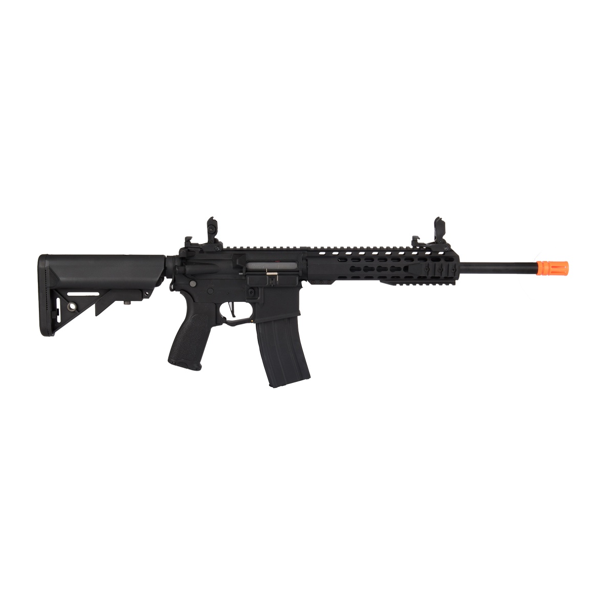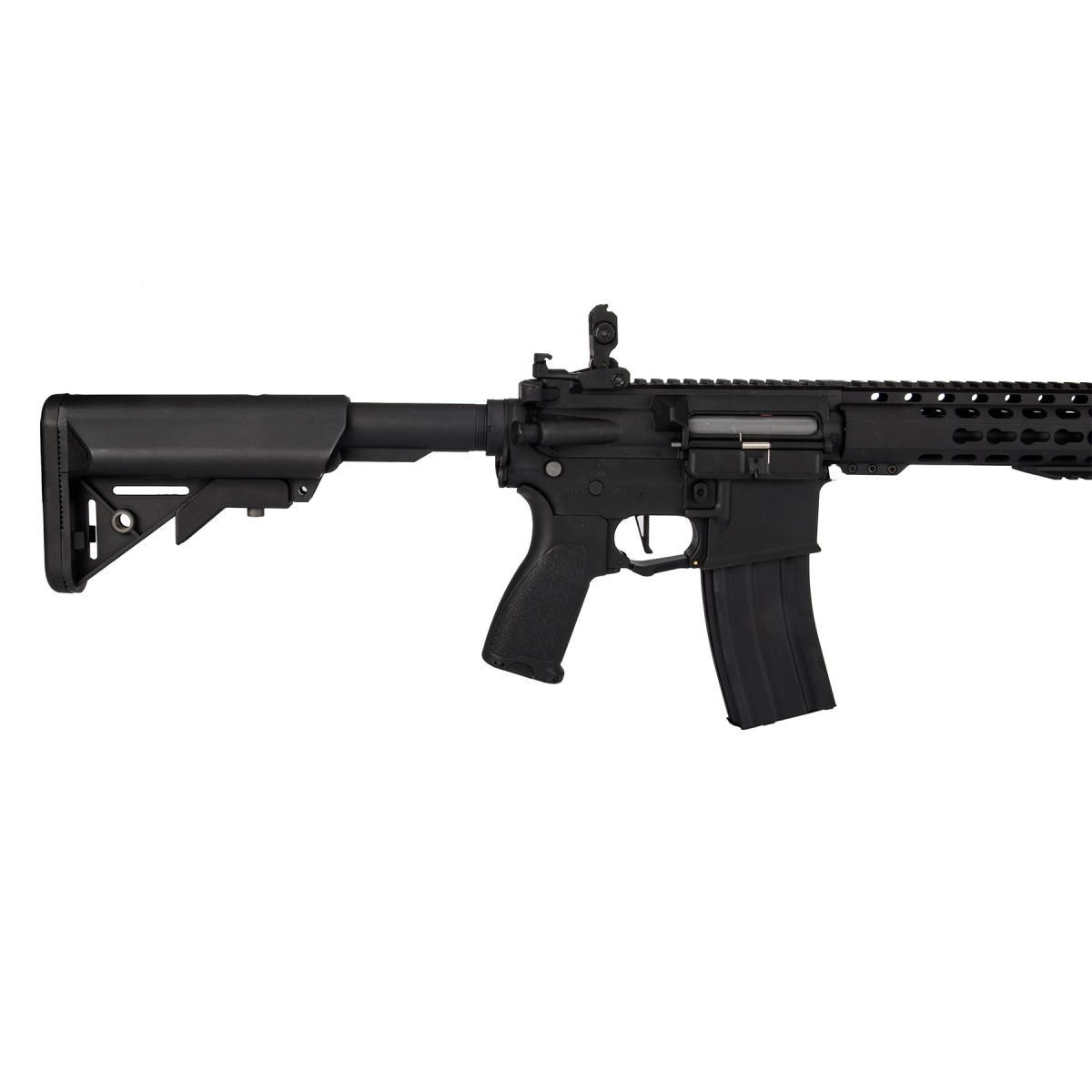 The Generation 2 Lancer Tactical entry level M4 Carbine has an outstanding list of features, taking their already impressive M4 Carbine 10" KeyMod AEG Rifle to the next level, with YOU along with it! The lightweight ABS construction of the Generation 1 rifle has now been reinforced with a tough nylon polymer, making it able to withstand heavy use in extreme situations while keeping the internals safe and efficient! The full metal outer barrel will not tarnish and ensures a fixed trajectory. The 20mm picatinny optic rail allows you to mount your choice of red dot sights and magnified scopes. This M4 AEG is a great airsoft gun for both outdoor and CQB engagements, with a six position retractable crane stock. The high performance generation 2 is easily one of the best priced rifles on the market! Upgraded Gearbox/Internals The Generation 1 rifle included upgraded internals, but Lancer Tactical took their line of generation 2's a step further to deliver more POW in its power! A quick change spring gearbox can be used to change your FPS from CQB to Outdoor MilSim on a whim, its ported piston head maintains excellent air compression inside the cylinder, and the included 6.03mm tightbore barrel gives you the range and precision you'd never expect from similar AEGs. The upgraded gearbox has even tougher metal gears that are much more efficient than the traditional pot-metal gears. The teeth along the cylinder are metal and the motor has been upgraded to move even faster. The metal inner barrel makes the weapon highly accurate even at longer range targets. The adjustable crane stock enables an easy-access battery storage of nunchuck and buffer tube type batteries. Low resistance wiring prevents any damage from high voltage batteries and also makes your trigger more snappy. Right out of the box, the M4 Carbine 10" KeyMod AEG Rifle is a force in combat.