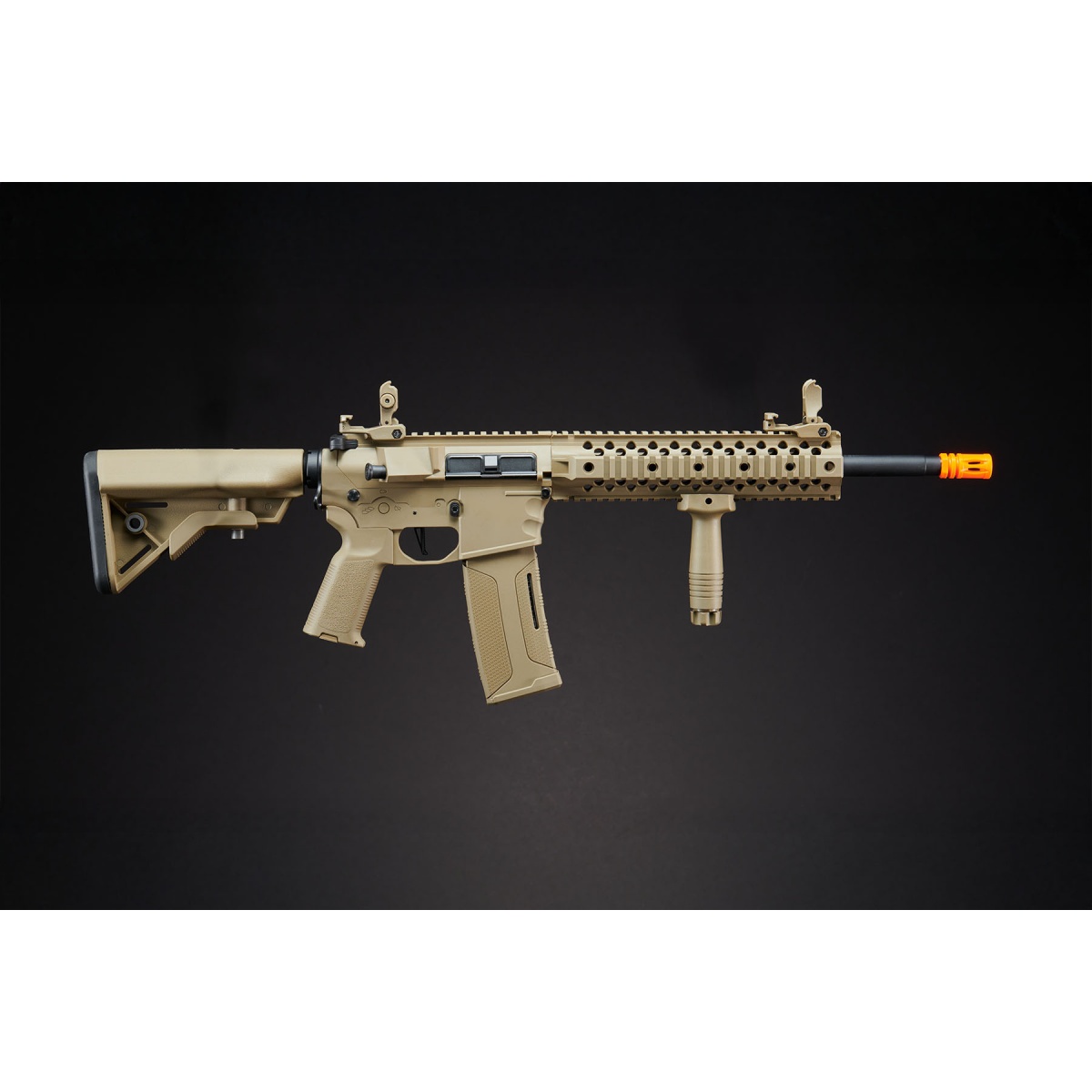 Designed for adaptability and aggressive play, the Gen 3 M4 Evo RIS features a free float 10 inch Picatinny and Weaver nylon polymer rail system that provides extensive mounting options for optics, lights, lasers, and PEQ boxes. A full length 20mm top Picatinny rail and upgraded flip-up front and rear iron sights ensure flexibility across different engagement ranges. The built-in Zion Arms fully programmable electronic trigger unit supports burst firing modes and works with the Lancer fast trigger to deliver a responsive shooting experience. Rear-wired Deans connectivity supports high output 11.1v LiPo batteries, while the included 130 round high speed mid-cap magazine ensures smooth feeding with reduced jamming. Additional refinements such as the textured pistol grip, finger grooved magwell for added control, and adjustable retractable stock make this rifle comfortable and versatile for a wide range of play styles. Finished in a tactical tan color, the Lancer Tactical Gen 3 10 inch M4 Evo RIS AEG stands out as a dependable, upgrade-ready airsoft rifle built for competitive gameplay.