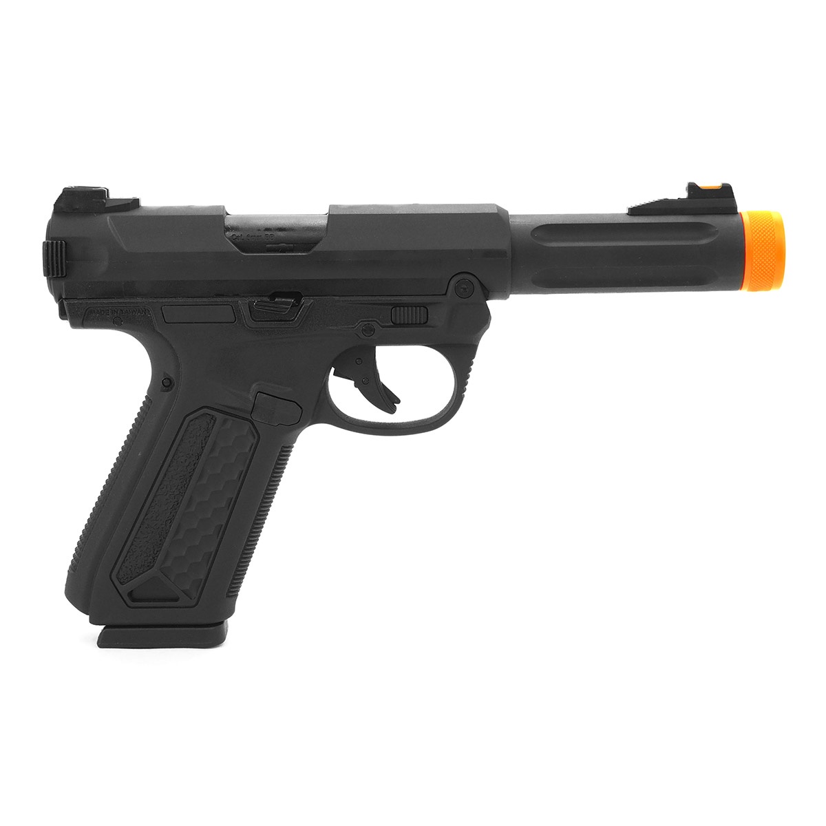 The AAP-01 Assassin is the first gas blowback airsoft pistol from Action Army Company. Renowned in the airsoft community for its upgrade parts, Action Army has expanded its product line into the gas blowback pistol market. Powered by green gas, the AAP-01 is capable of both semi-auto and full-auto firing modes by flipping the fire selector on the underside of the bolt carrier. All of the controls such as the magazine catch, safety, and slide catch are either ambidextrous or reversible, making the pistol friendly for right-handed or left-handed users. Included with the pistol are two optional accessory rails for above the receiver and below the barrel for installing sights or lights/lasers if desired. The barrel is 14mm CCW threaded underneath the orange thread protector, making it compatible with most airsoft muzzle devices and accessories.
