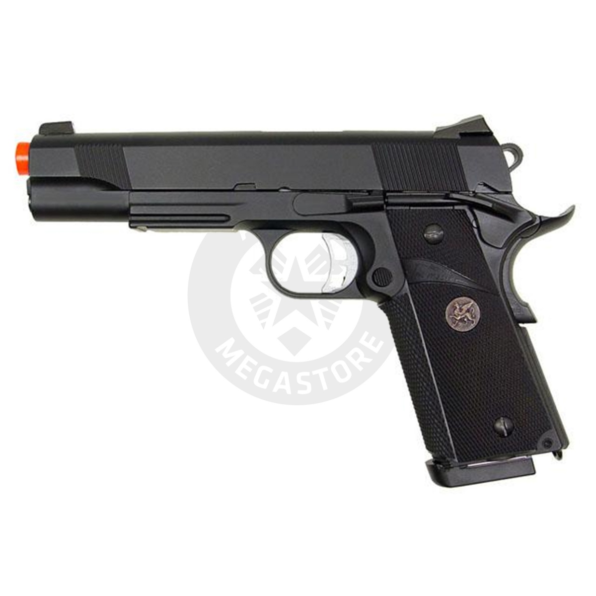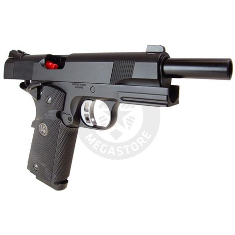 Experience precision and power with the KJW KP07 M1911 Full Metal Tokyo Marui System Gas Blowback pistol. Built for performance, it features a full metal construction, tactical railed frame, and adjustable hop-up system. With functional safety features like the on-frame safety and grip safety, along with a rubber tactical grip for enhanced control, it offers reliability and ease of use. Compatible with both green gas and CO2 magazines, it ensures versatility on the field. Made in Taiwan, this pistol boasts quality craftsmanship and a Gryphon emblem for added style. Dominate the battlefield with this top-tier airsoft sidearm from KJW.