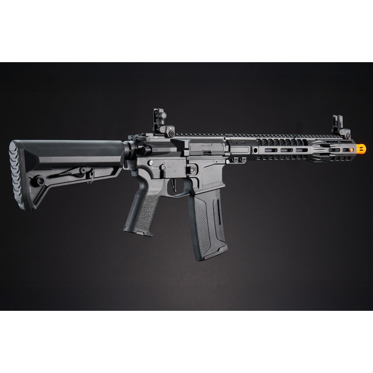 Internally, the rifle is equipped with a 6.03 mm tightbore inner barrel that helps improve accuracy and shot consistency across typical engagement distances. The functioning bolt catch provides fast access to the hop up for on the fly adjustments, while the quick change spring system allows easier FPS tuning to meet field requirements. Ambidextrous fire controls and charging handle support left and right handed users equally, adding versatility during gameplay. The NSR adjustable stock accommodates larger batteries and allows players to tailor length of pull for comfort and control. Sold as a complete package with a rechargeable battery and charger included, the Lancer Tactical SLR SD Gen 2 AEG Airsoft Rifle offers a strong entry point into competitive airsoft while also appealing to players seeking licensed components, modular compatibility, and dependable performance in a sleek black finish.