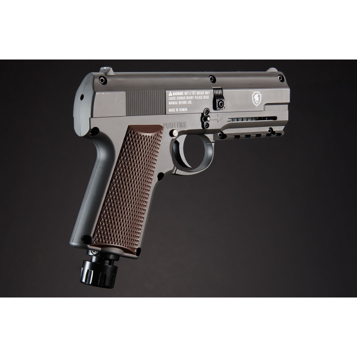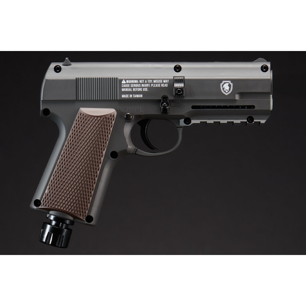 Lancer Defense Hornet 0.43 Cal CO2 Powered Less Lethal Defense Pistol Full Set in black is a purpose built option for home defense where you want strong deterrence without going full lethal. This semi automatic platform uses an 8 g CO2 cartridge to propel 0.43 caliber projectiles at an advertised 380 feet per second with energy up to 11 joules, giving you meaningful stopping power inside typical home distances. The non blowback action directs more gas to the shot for efficient velocity and fast follow ups, while a functioning safety provides an extra layer of control. A polymer body keeps weight to about 2 pounds with an ergonomic textured grip that feels secure and balanced. Built in iron sights make target acquisition straightforward, and an under barrel Picatinny rail segment lets you mount a light or laser for low light confidence. With an effective range listed at 30 meters, the Hornet offers reliable accuracy for personal protection scenarios.
