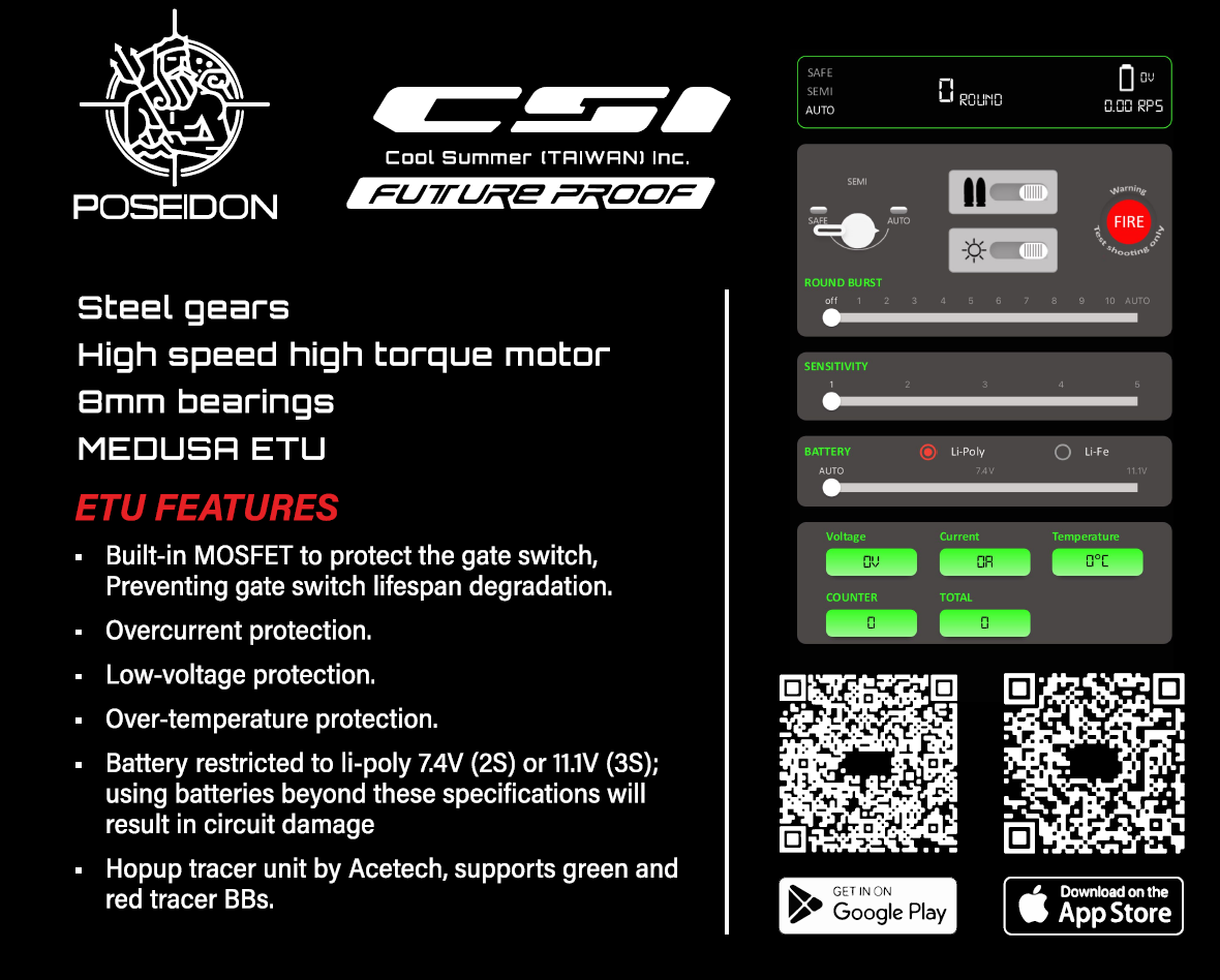 Introducing the Poseidon Punisher Rifle and advanced Medusa App Based Programmable Mosfet. – a pinnacle of precision and power. Crafted with a durable nylon and fiber body, this black beauty houses an 8mm Gearbox V2 for unparalleled impact resistance. The ambidextrous selector switch and quick spring release system offer unmatched versatility. Enhance control with the vertical trigger and batwing charging handle. The ergonomic, non-slip grip adds comfort to your grip. Paired with a 220-round AEG M4 Midcap Magazine, Poseidon's Punisher Rifle is your ticket to dominance. Elevate your airsoft game and seize victory.