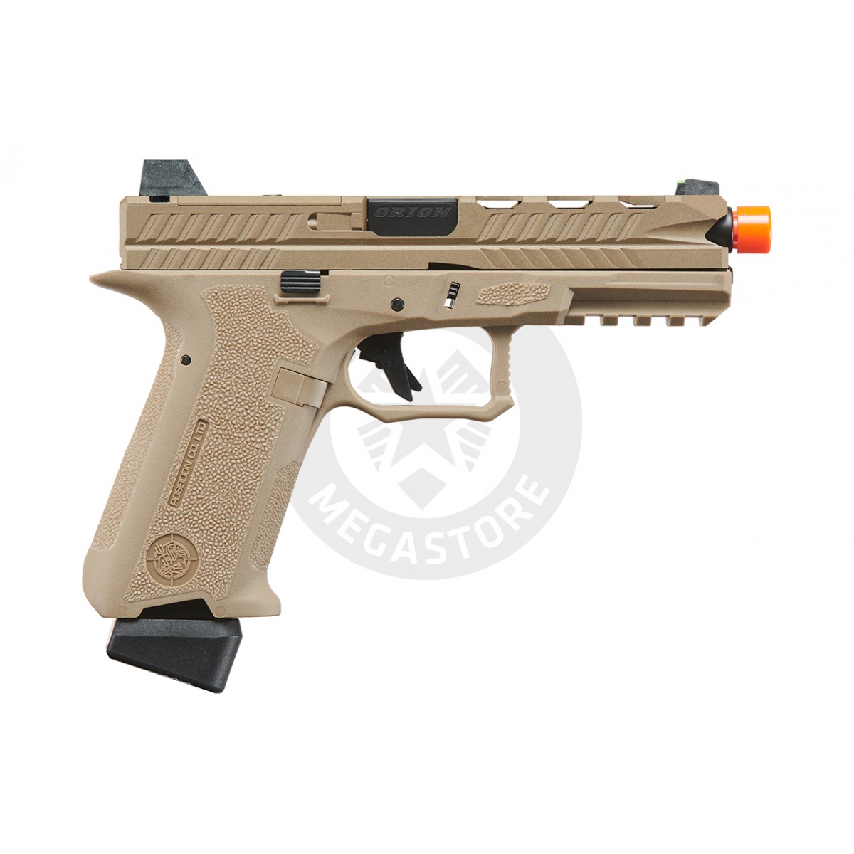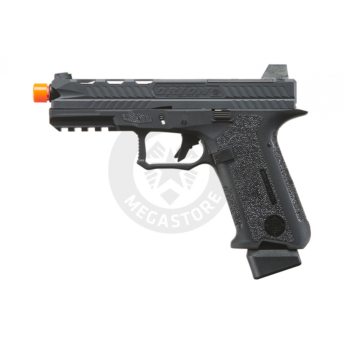 Introducing the Poseidon Orion Combat GBB Pistol No. 2, featuring the ergonomic Shark scales for a comfortable grip and enhanced shooting stability. With a robust polymer slide, this pistol boasts the Poseidon system, surpassing 50000 test rounds without nozzle issues. The patent-built semi/full auto selector, compatibility with RMR, and compact design make it a versatile choice. Standard gear includes an aluminum muzzle protector and steel muzzle adapter. Embrace Poseidon's innovation and precision for a reliable, high-performance airsoft pistol. Elevate your gameplay with this top-tier, adjustable hop-up sidearm, suitable for both semi and fully automatic action. Upgrade today for a powerful and compact airsoft experience.