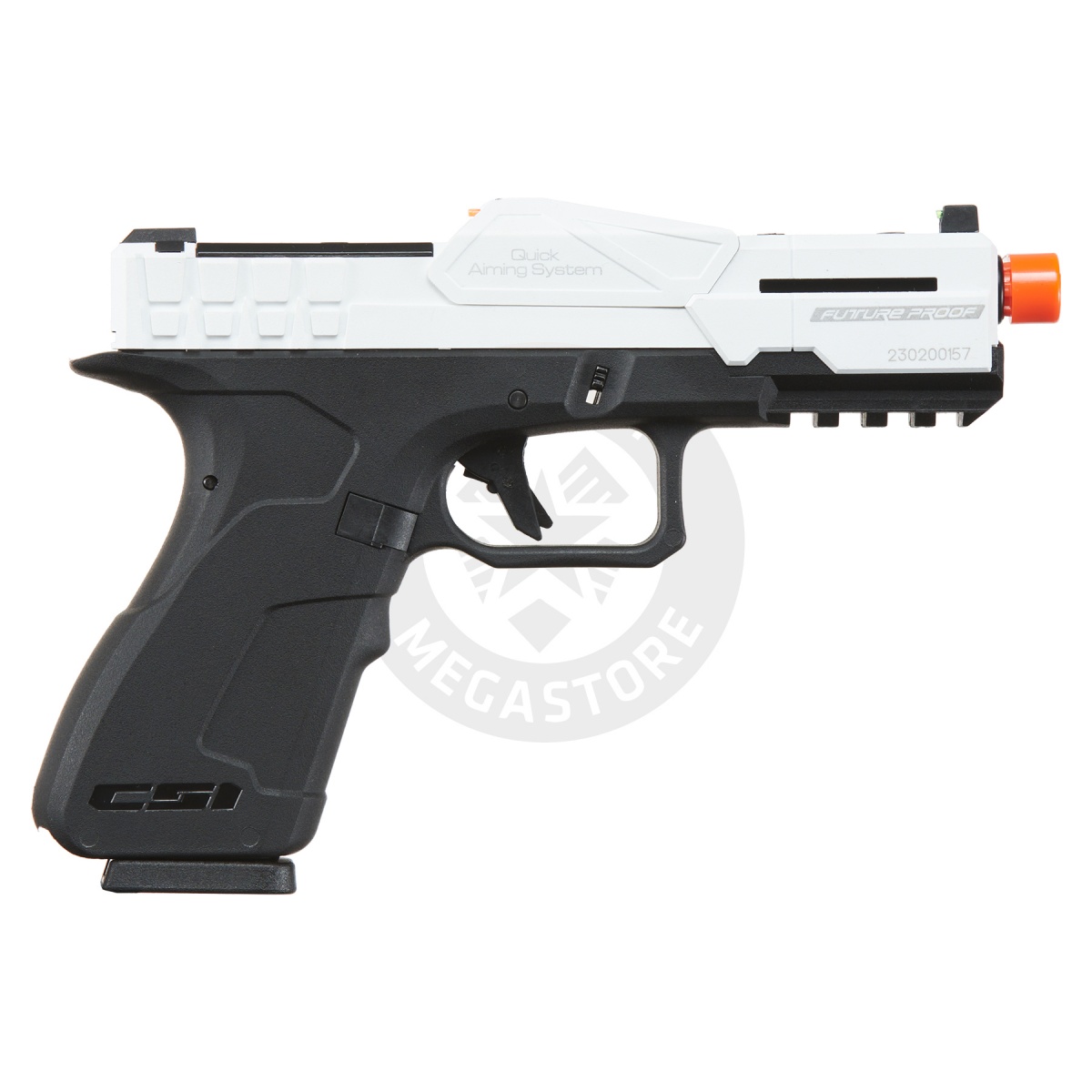 Introducing the CSI XG8 Aluminum Pistol in White/Black. Boasting an aluminum muzzle protector and steel adapter, this pistol features a polymer slide system and exclusive internals. The patent-built semi/full-auto selector, hidden within the slide, adds versatility. Designed for compatibility with RMR, the CSI XG8 offers a unique and high-performance experience. With a 25-round magazine and a striking white/black 2-tone finish, this polymer-framed pistol stands out on the field. Elevate your sidearm game with the CSI XG8, exclusively available at Airsoft Megastore. Order now for a cutting-edge airsoft pistol that combines style and functionality.