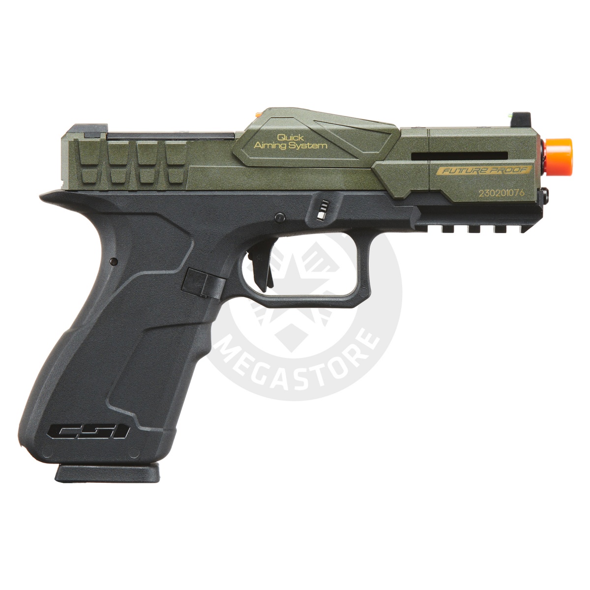 Introducing the CSI XG8 Aluminum Pistol in OD Green/Black. Boasting an aluminum muzzle protector and steel adapter, this pistol features a polymer slide system and exclusive internals. The patent-built semi/full-auto selector, hidden within the slide, adds versatility. Designed for compatibility with RMR, the CSI XG8 offers a unique and high-performance experience. With a 25-round magazine and a striking white/black 2-tone finish, this polymer-framed pistol stands out on the field. Elevate your sidearm game with the CSI XG8, exclusively available at Airsoft Megastore. Order now for a cutting-edge airsoft pistol that combines style and functionality.