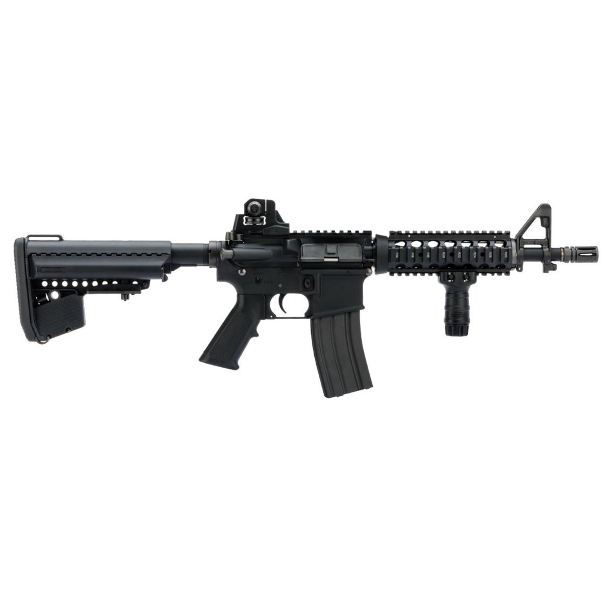 The Tokyo Marui Next Generation Recoil Shock System M4 AEG Rifle - (Black) brings an elite level of realism and performance to the airsoft field, making it one of the most immersive AEG experiences available. Built with a heavy-duty CNC aluminum upper receiver and fully licensed Colt trademarks, this rifle captures the authentic feel of a real steel M4. At the heart of the platform is Tokyo Marui's revolutionary Next Generation Recoil Shock System (NGRS), which delivers a realistic simulated recoil and muzzle flip with every shot. When paired with an NGRS magazine, the bolt locks back after the final round, enhancing the realism even further with a functional bolt catch release that resets the system to continue firing. Measuring 705mm to 780mm in length (adjustable) and weighing 3370g, the rifle balances solid construction with field-ready handling. Its 275mm inner barrel and adjustable hop-up allow for excellent range and accuracy, making it perfect for mid- to long-range engagements. The flat-top Picatinny rail and quad rail handguard provide ample space for optics and tactical attachments, while the adjustable VLTOR-style stock includes a storage compartment for battery placement. Whether you're looking for a "Tokyo Marui recoil AEG," "realistic airsoft M4," or "NGRS M4 AEG rifle," this model delivers unmatched craftsmanship, reliability, and realism straight out of the box. Ideal for serious players who demand more than just another M4, the Tokyo Marui NGRS M4 AEG is available now and ready to elevate your loadout.